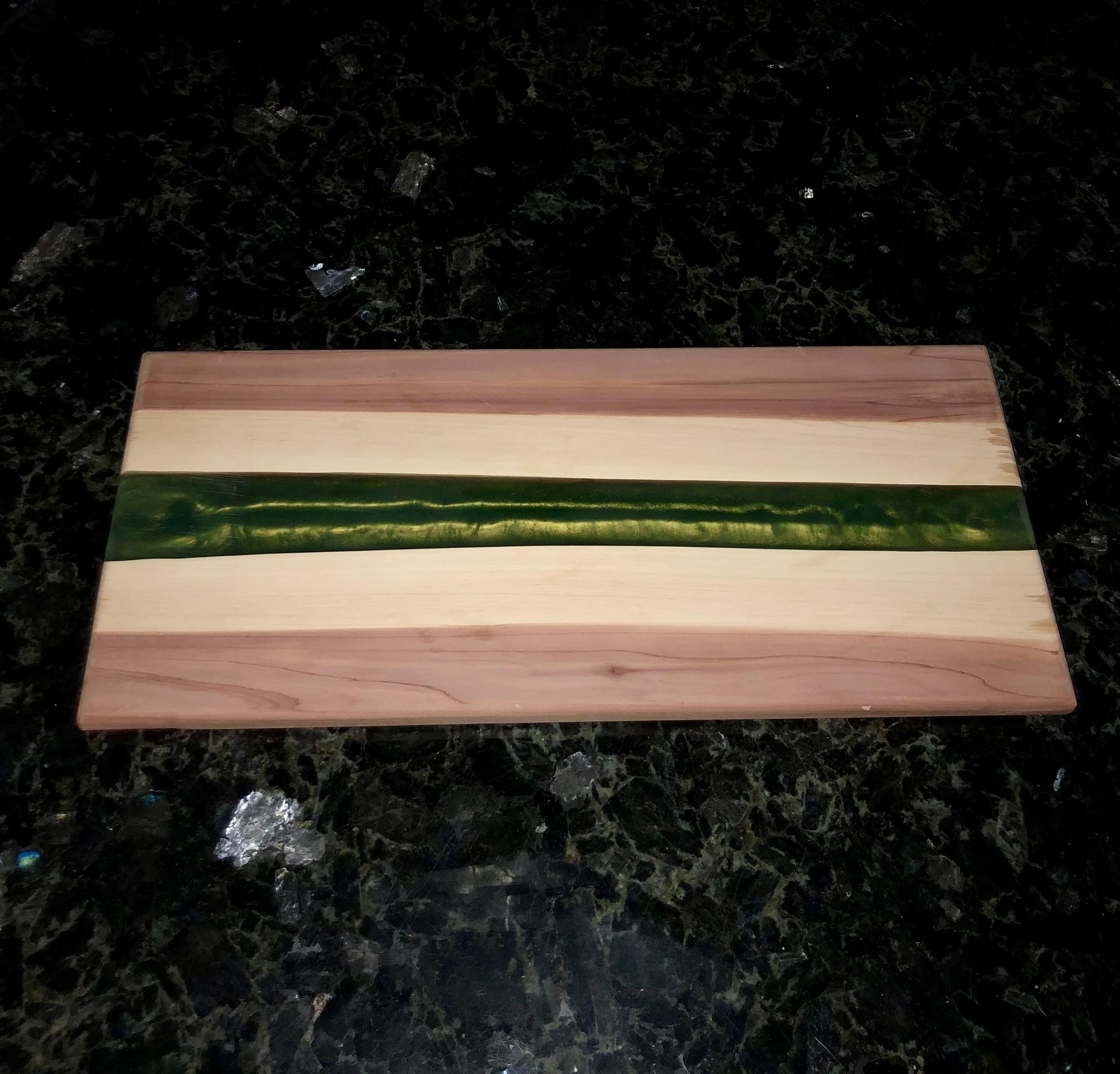 Epoxy and Hardwood charcuterie board. Red Cedar wood with Olive Green epoxy river. Smooth finish.